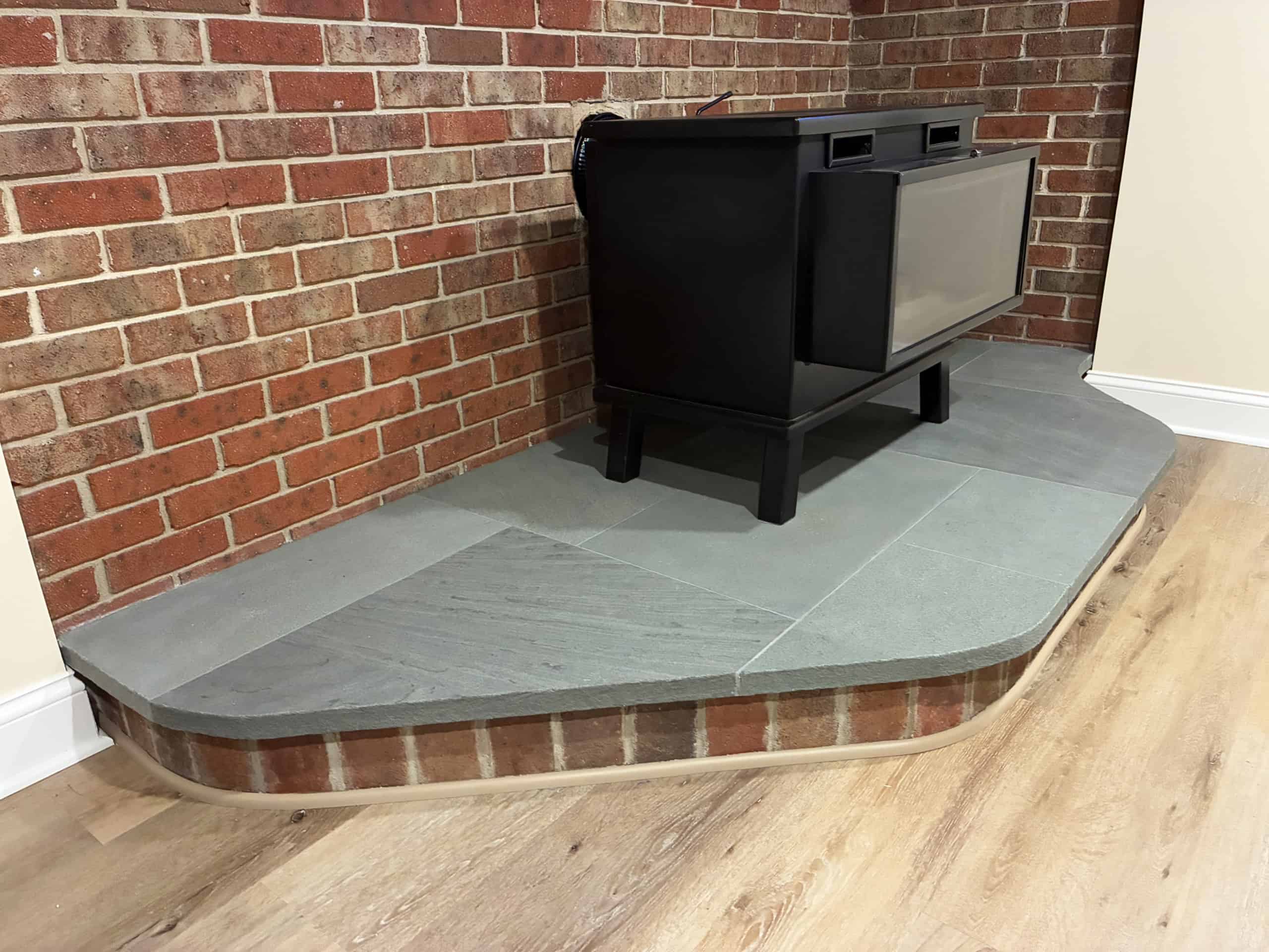 The neutral bluish-gray color of thermal bluestone treads matches extremely well with almost any shade of brick. The two materials really compliment each other well in almost any project. Bluestone treads look great with brick risers, brick landings look good with bluestone borders, and bluestone accents can be used on varying specialized applications such as pizza ovens, mailboxes, fireplaces, etc.